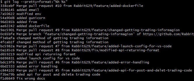 commit hash는 git log 명령어로 확인하거나, 소스트리와 같은 GUI 프로그램으로 확인할 수 있다. 본인은 CLI 환경을 주로 사용하기 때문에 git log --pretty=format:"%h %s" 명령어로 확인한다. 이 명령어는 로그의 포맷을 지정해주는 명령어다.