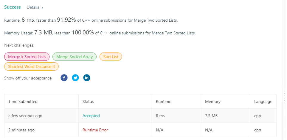 1번의 경우에는 O(nlogn)의 정렬을 쓰면 될 것 같긴 했지만 2번으로 풀기로 생각했다. C++에서는 기본적으로 Linked-List로 주어졌기 때문이다.