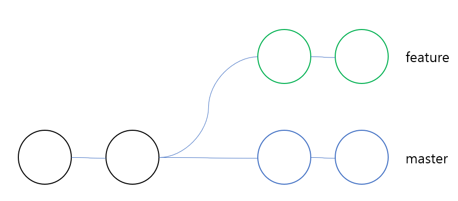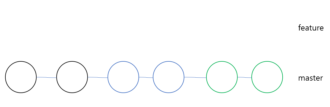 예를 들어, 커밋 줄기가 아래와 같다고 생각해보자. feature 브랜치와 master 브랜치의 개념에 대해서 알고 싶다면 예전 글을 읽고 오면 좋다.