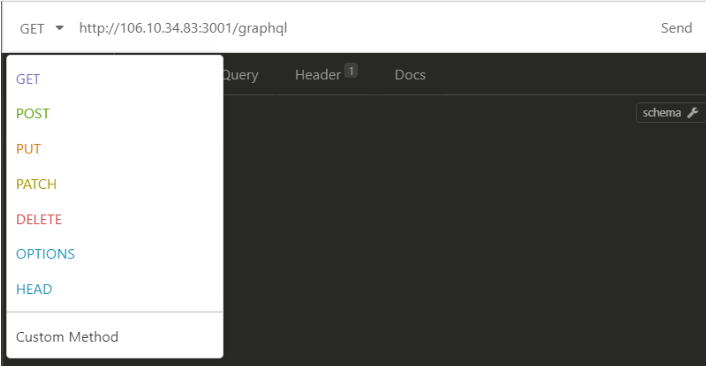 중앙 상단 부분이다. HTTP Method를 지정할 수 있으며(RESTful API에 대해서는 다른 글에서 다루도록 하겠다), 그 옆에 URI를 지정한다. domain을 사용하지 않은 URL에 익숙치 않은 분들을 위해 보충설명하면 106.10.34.83이 공인 IP 주소이고, : 뒤의 3001이 개방한 포트이다. /graphql은 endpoint이다.