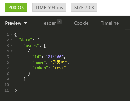 우측에서 request에 대한 결과를 받아볼 수 있으며, 응답 코드, response, header 등에 대한 정보를 확인할 수 있다.